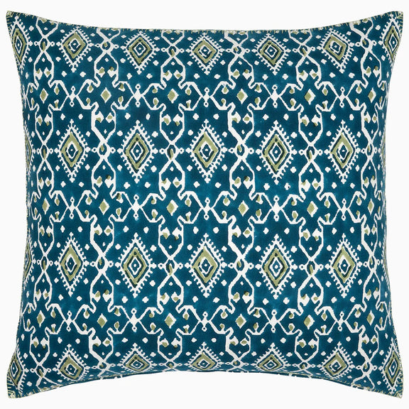 Delicious lozenges display themselves in deep peacock and soothing sage. Hand block printed on cotton linen with hand stitched edging in green. Same print on front and back.