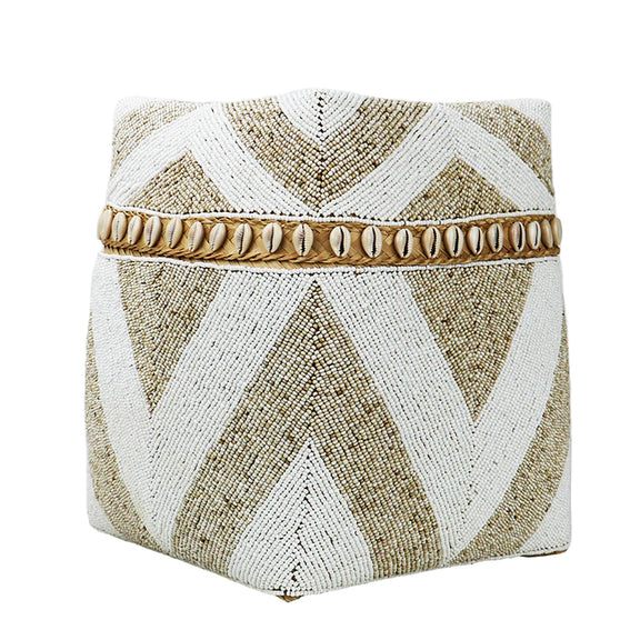 A rattan weave basket that is decorated in a white and taupe bead blend, the Bali Beaded Box, Tall, features a bold chevron-inspired pattern. The lidded box is great for decoratively tucking away trinkets on a shelf or bedside.