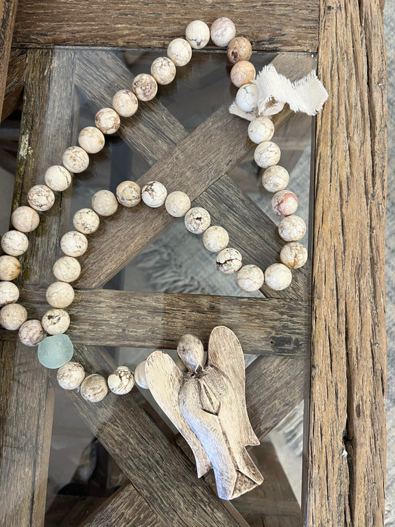 ANGEL IS HANDCARVED WOOD SUSPENDS FROM WHITE BEADS WITH AFRICAN RECYCLED AQUA GLASS FOCAL.