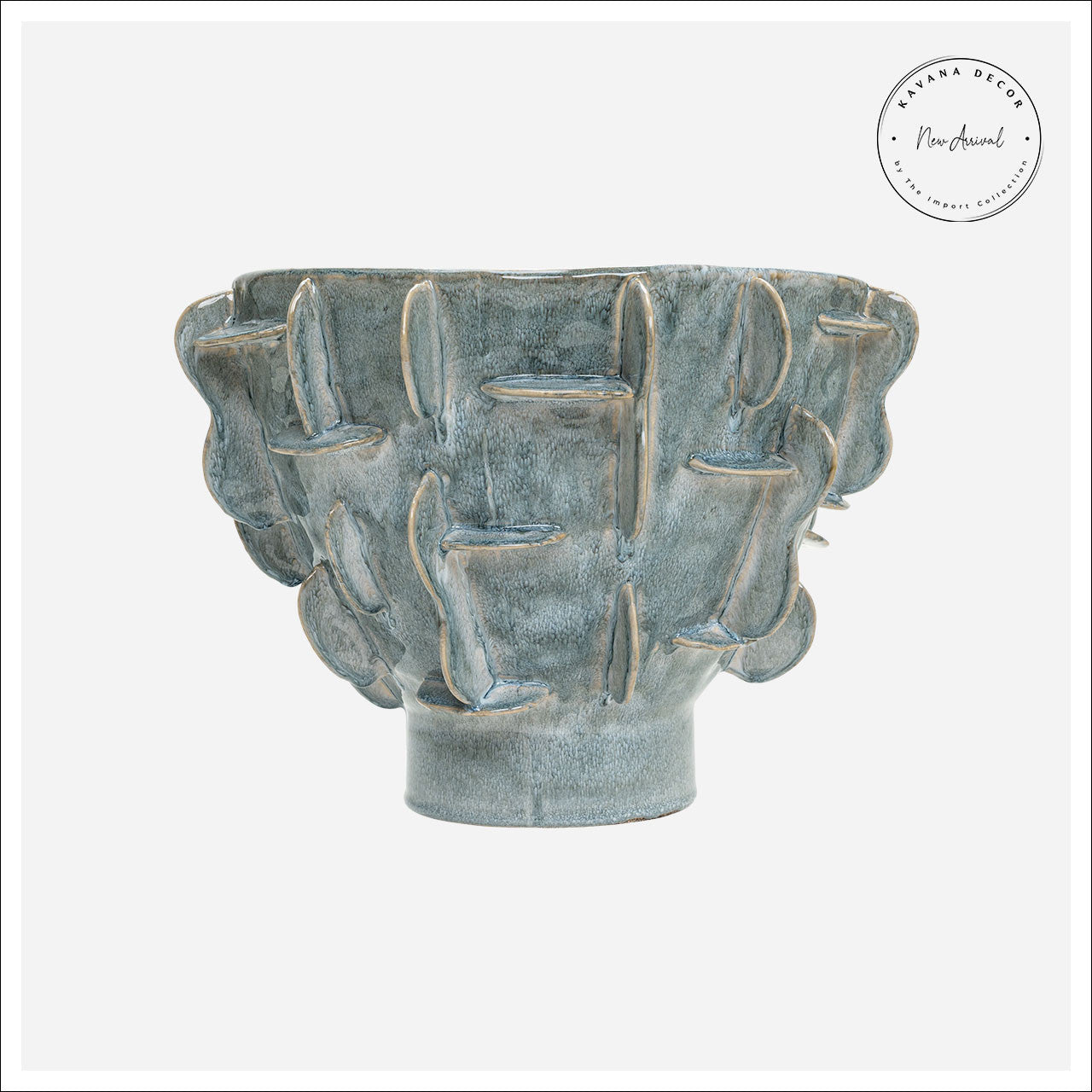 Made from porcelain and finished in a soft blue glaze, this round bowl captures attention with its sculptural silhouette and dimensional ridges that cascade along the surface. Measuring 13 inches long, 13 inches wide, and 10 inches high, it is both substantial in scale and versatile in function, making it suitable for use as a centerpiece on dining tables, console tables, or coffee tables.