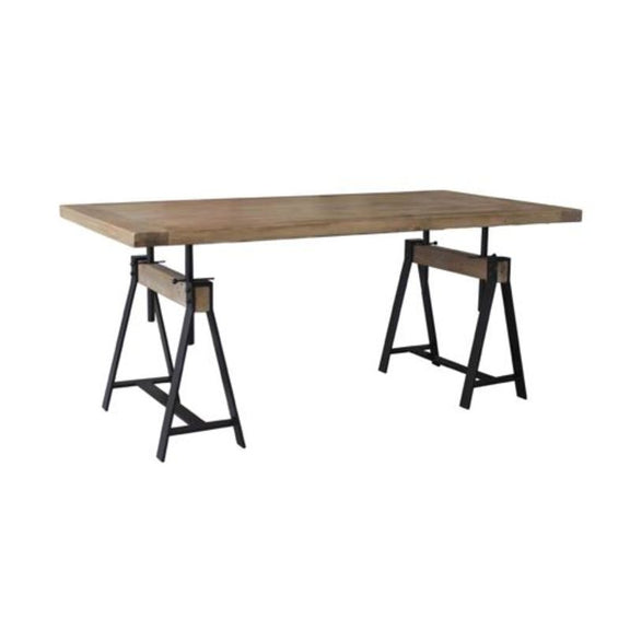 Moving easily between dining and counter height, this versatile table can play many roles in your home. From crafts and games and dining for six, any activity can be easily accommodated with a simple adjustment of height. To change the height, simply pull the pins out and place them in another hole on the metal support. The reclaimed pine top features a breadboard end and clear coat finish.