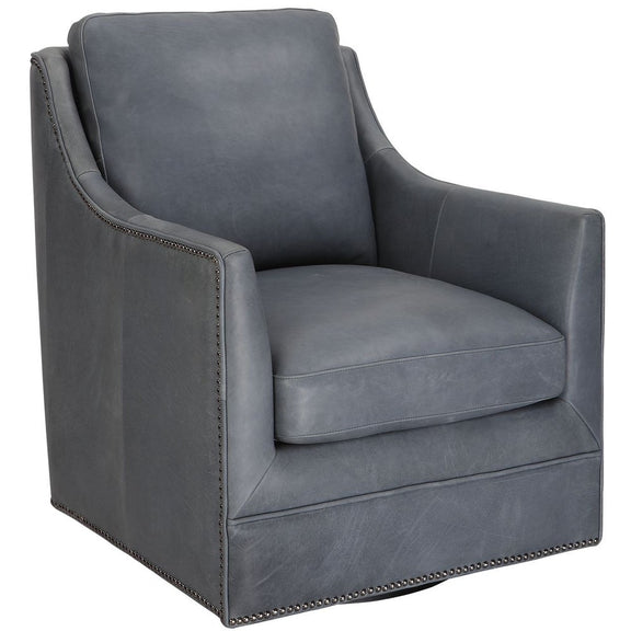 A classic leather lounge chair with a twist. With its swivel base, distressed blue/grey full grain leather and polished nickel nail head accents, this comfortable box cushion chair will definitely turn heads. Since leather is a natural product, color and texture will vary slightly, enhancing the chair's uniqueness.