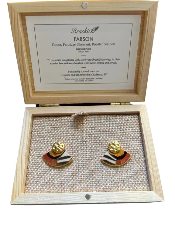 Beautiful golden pheasant, partridge, goose and rooster feathers are hand-selected and perfectly placed to create these simple but stunning rust and camel fan studs.