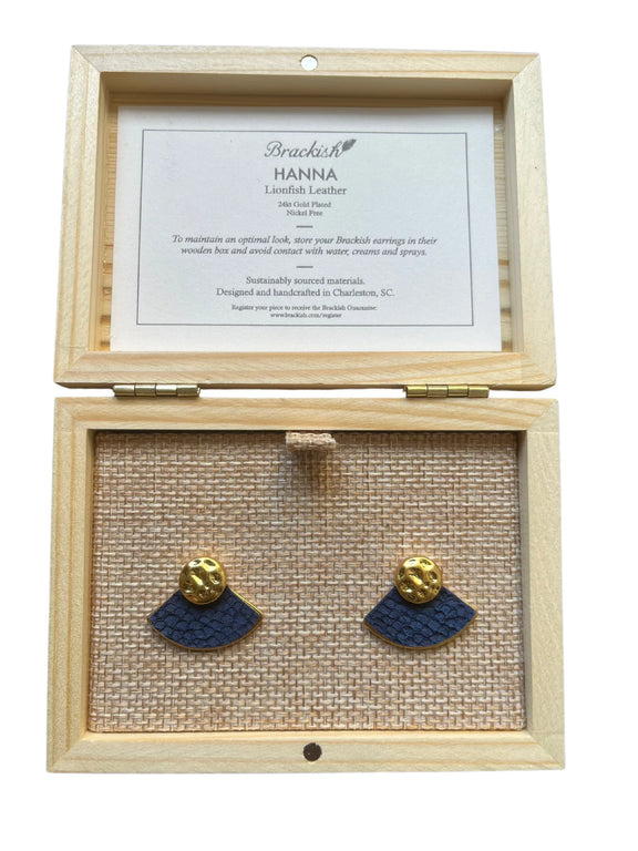 The Hanna stud earrings are crafted with leather made from the invasive Lionfish. Invasive lionfish threaten native fish and the environment in U.S. Atlantic coastal waters.