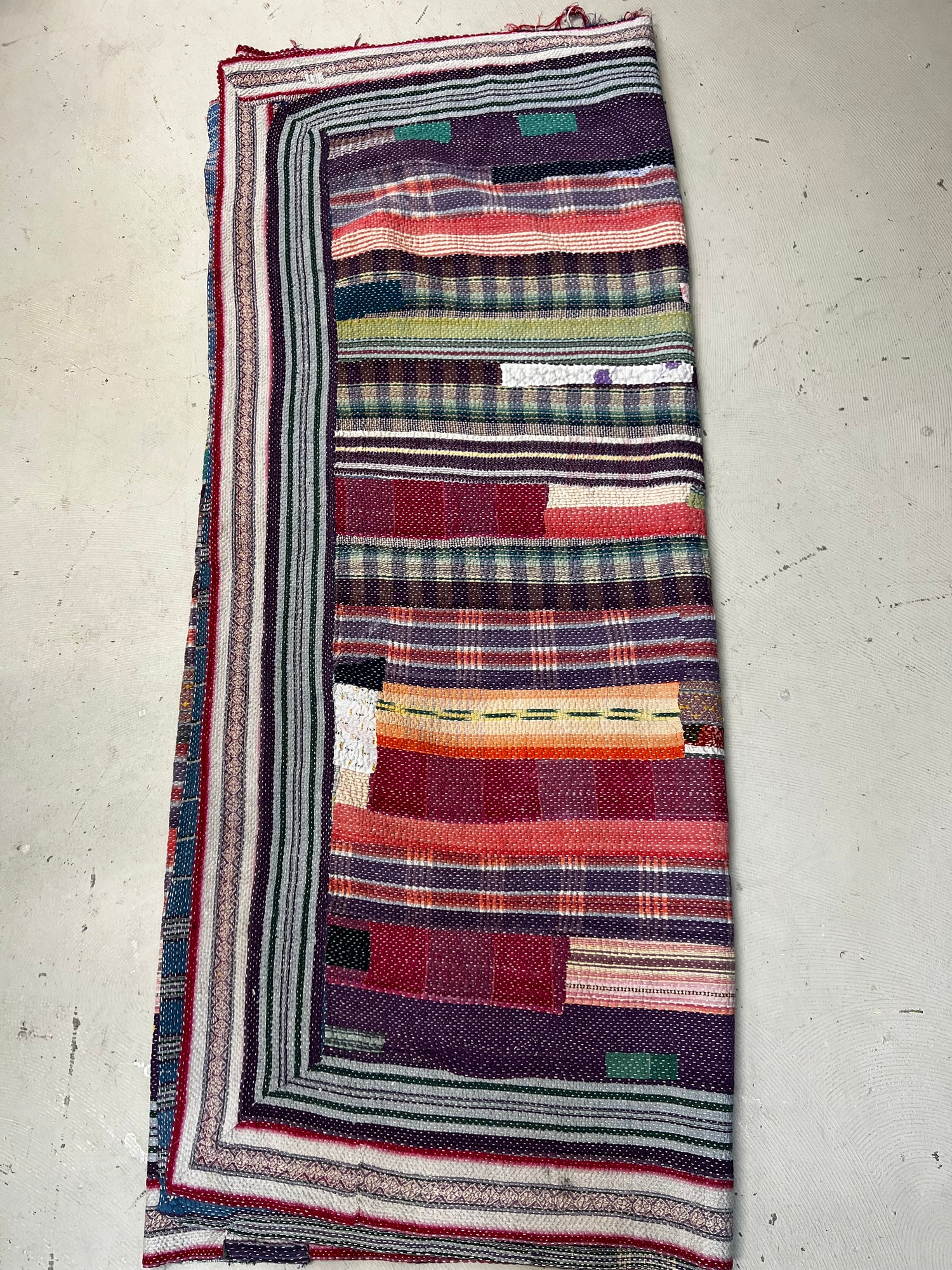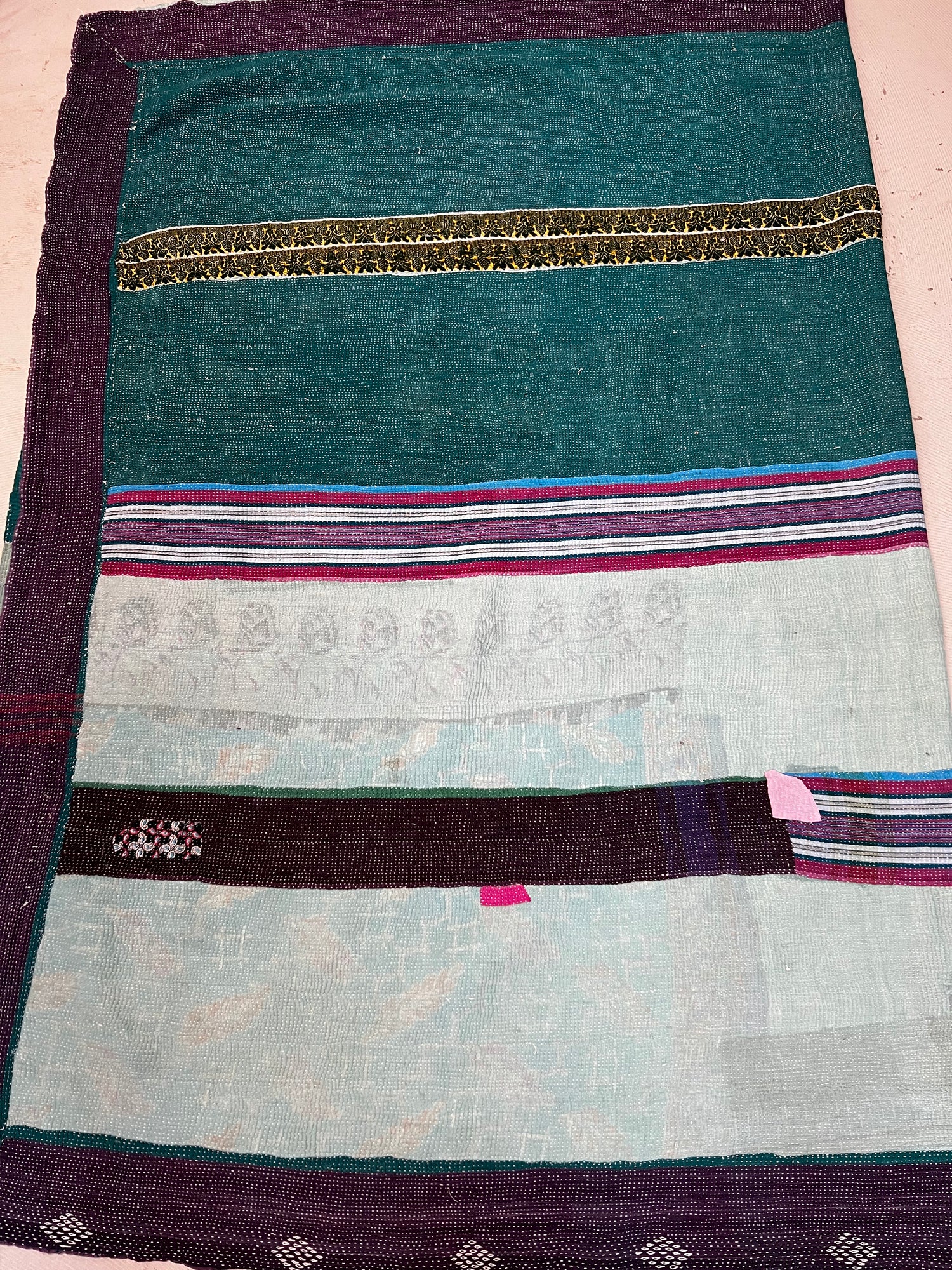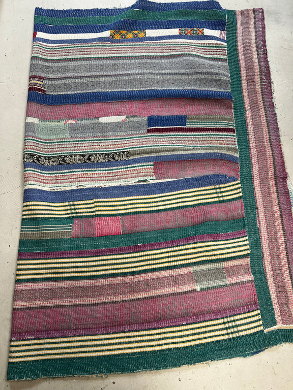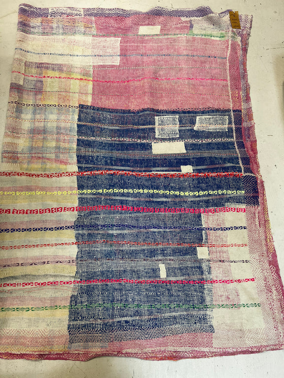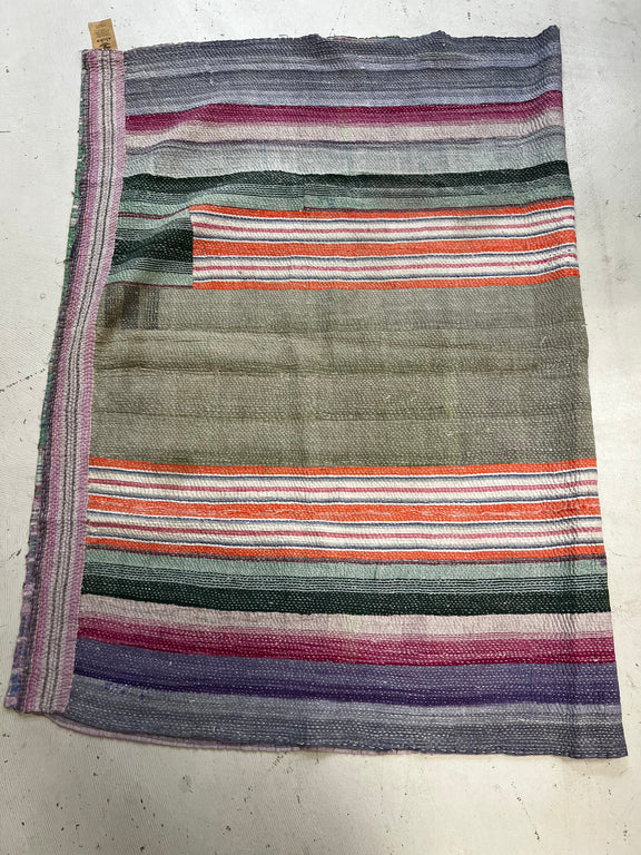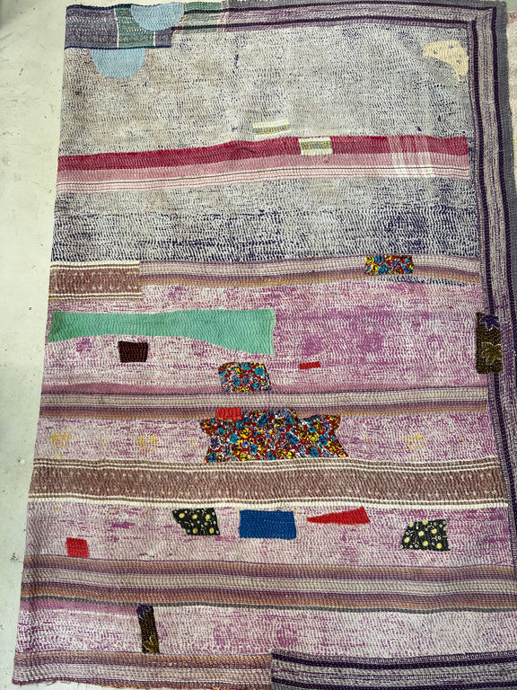 Dating back centuries, Indian women stitched together old saris to create large blankets and floor cloths. We attentively pick each quilt, typically 60-80 years old, with an eye toward material integrity and unusual beauty. Some are like weighted blankets. Others are more delicate. Details are denoted in product descriptions. All are super soft, an aloka signature.