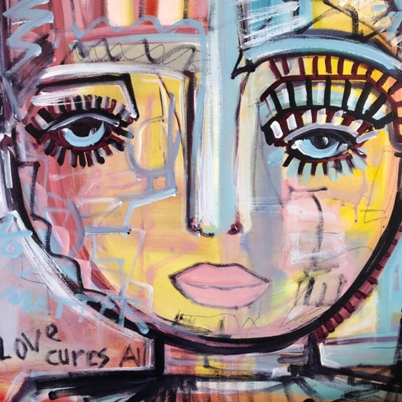 I painted "Resolute" to capture the poignant emotions that come with a life marked by challenges and hardships. Her expression reflects the weight of her experiences, conveying a sense of melancholy yet undeniable strength. The words "love cures all" are inscribed in a slightly awkward manner, representing the imperfect but enduring power of love to heal wounds and mend the scars of life's trials. "Resolute" is a tribute to the human spirit's ability to endure, persevere, and find hope even in the face of adversity. Through the woman's gaze, I wanted to convey the depth of her resilience and the reminder that love's transformative touch can bring solace and restoration to even the most weathered hearts.