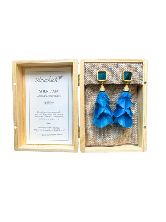 A luxe statement piece, the Sheridan pairs rich sapphire goose feathers with striking peacock feathers for sophisticated and stunning style.